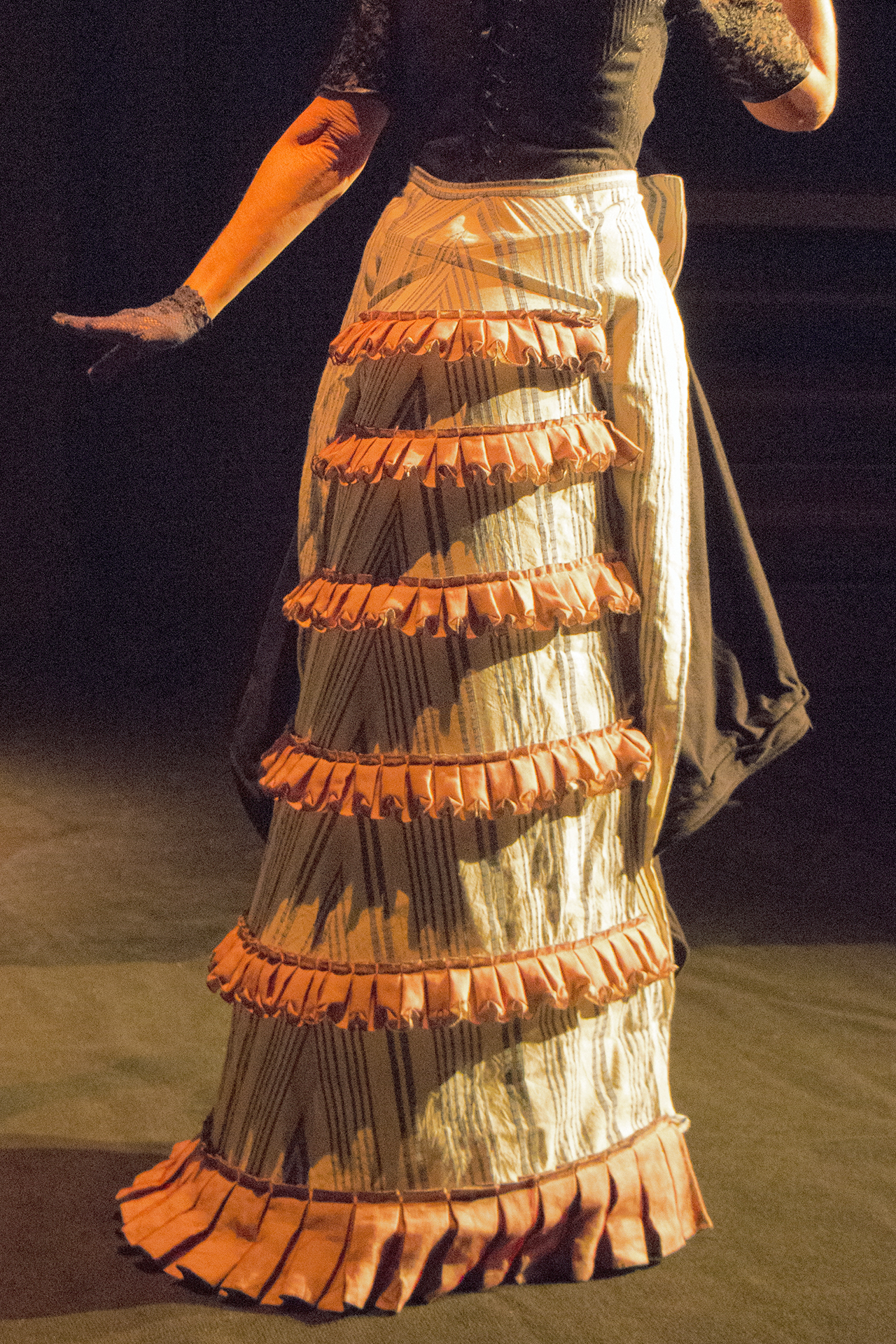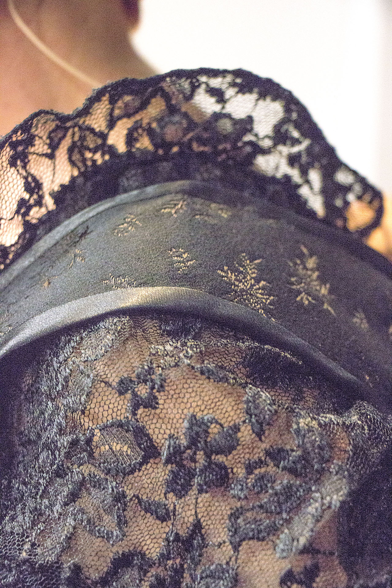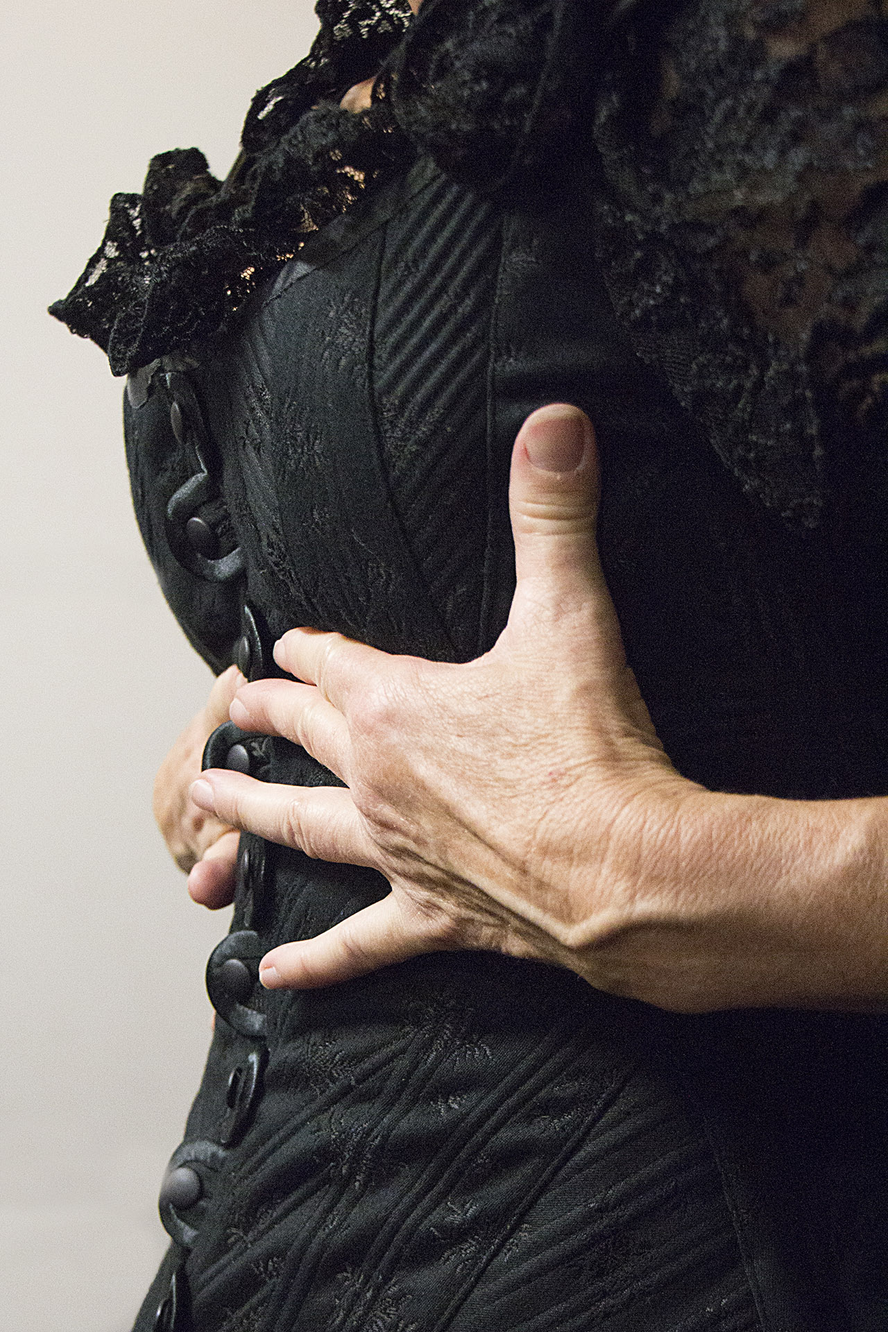 « M’inspirer des « Cocottes » de la Belle Époque, me laisser séduire par la grâce d’un décolleté, rehausser une taille sulfureuse par un corset XIXème à goussets. Accepter l’invitation d’une féminité scandaleuse avec une tournure des années 1800. Plonger dans le noir de l’élégance et le rouge incandescent de la passion. »