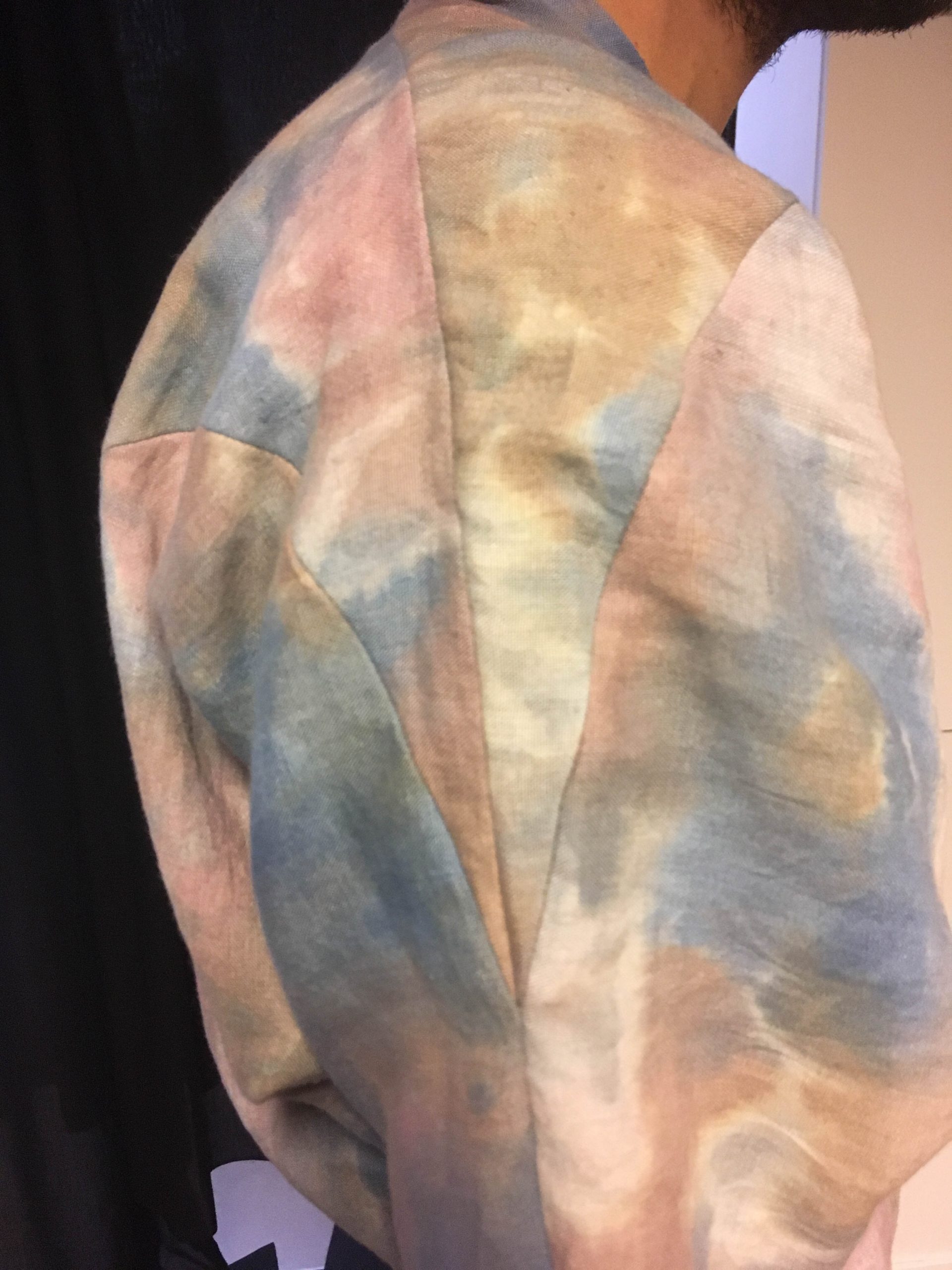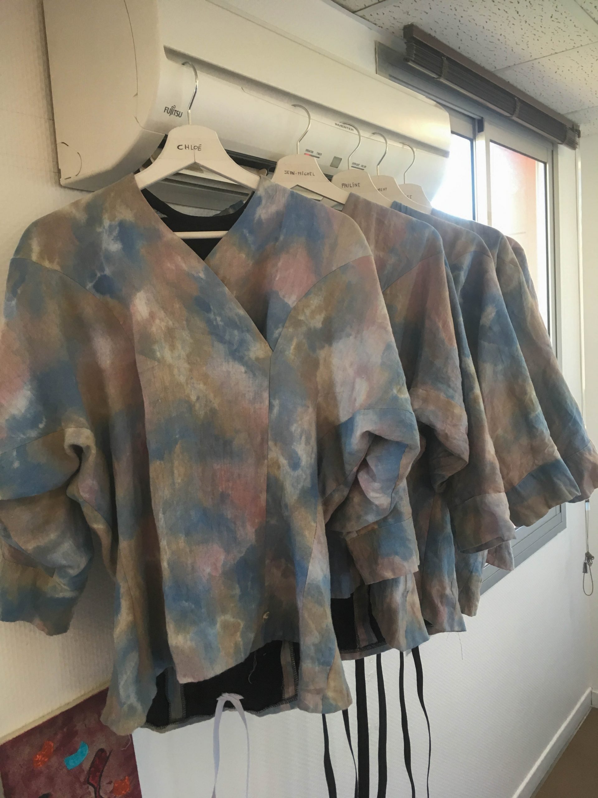 « À la manoeuvre avec moi un équipage de choc, Manon Ride stagiaire et Guilhem Mineau costumier, pour une traversée unique… Un Titanic magique… Dans les soutes de nos inspirations, nous avons hissé la couleur bleue..celle qui ne fait pas de vagues, consensuelle et divine, symbolisant la couleur de l’océan. En maintenant le cap de nos destinations japonaises, les manches kimono et les pantalons larges naviguent sous le vent.